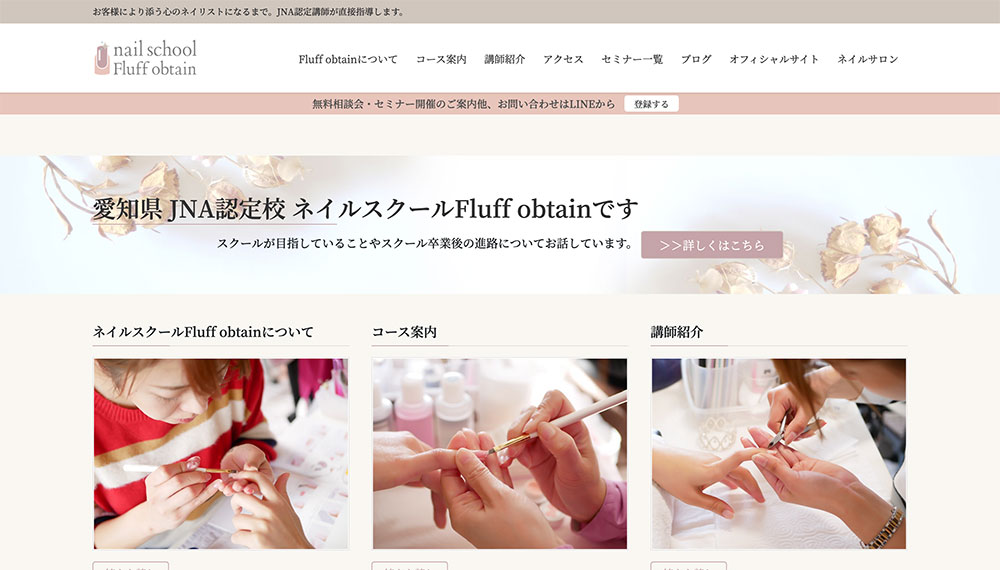 Fluff公式サイト、他2サイト 2021年2月28日 最終更新日時 : 2026年2月14日 カイエダ ミエ サイト名 Fluff公式サイト ケアサロンFluff ネイルスクールFluff obtain クライアント:FLUFF株式会社 取締役社長 三浦 由貴子様 行ったこと: 公式サイト制作(WordPress) スクールサイトリニューアル(WordPress) サロンサイトリニューアル(WordPress) 全体的なデザイン調整 文章添削(ブログ記事、ステップメール文章、メルマガ登録特典 PDF文章、ランディングページ) URL https://fluff-fluff.com/ https://fluff-fluff.com/nail/ https://salonfluff.com/ Fluff公式サイト ケアサロンFluff ネイルスクールFluff obtain