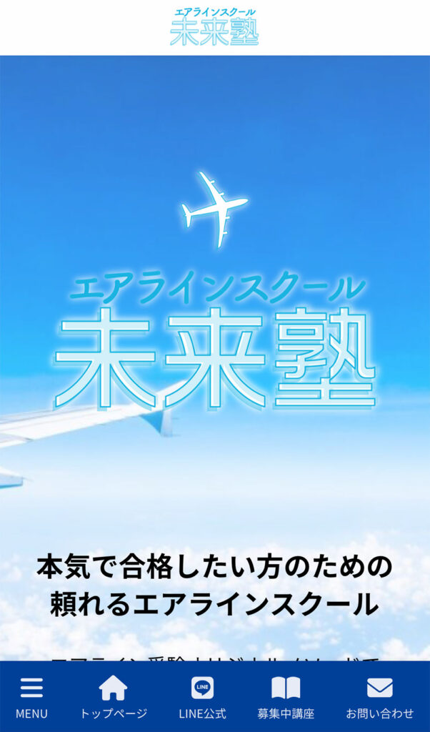 今回ご紹介するのは、 2018年もリニューアルデザインさせていただきました「エアラインスクール未来塾」さんのWebサイトです。リニューアルから4年経ち、気分一新、ホムペGOGOプランでリニューアルの運びとなりました。