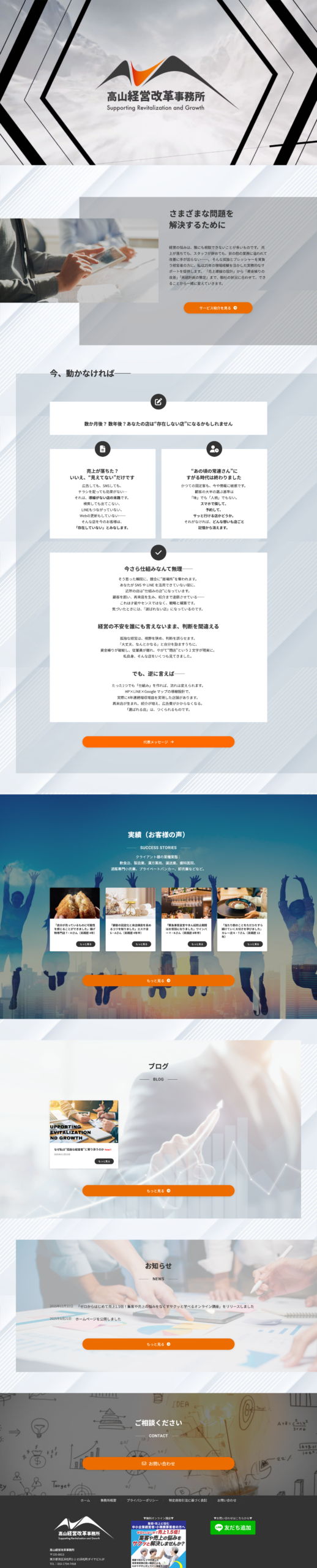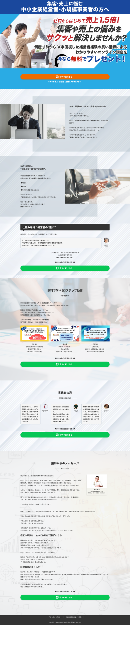 東京都の経営コンサルタント 高山経営改革事務所様を「トータルプロデュース」いたしました。ホームページ作成から始まり、LP制作、無料オンライン講座用動画シナリオ作成、ステップLINE文章執筆、Meta広告出稿代行・設置など手掛けました。このたびはご依頼ありがとうございます。
